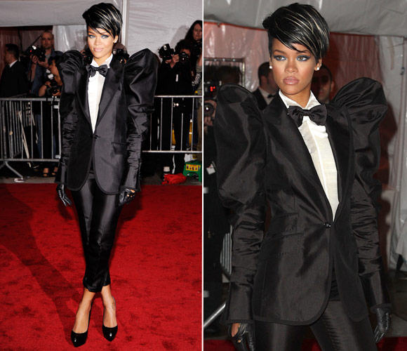 Rihanna ama saias e vestidos, mas ao optar por um terninho também não deixou de lado seu estilo extravagante: o look com mangas superbufantes e corte sequinho foi um sucesso no baile do MET!
