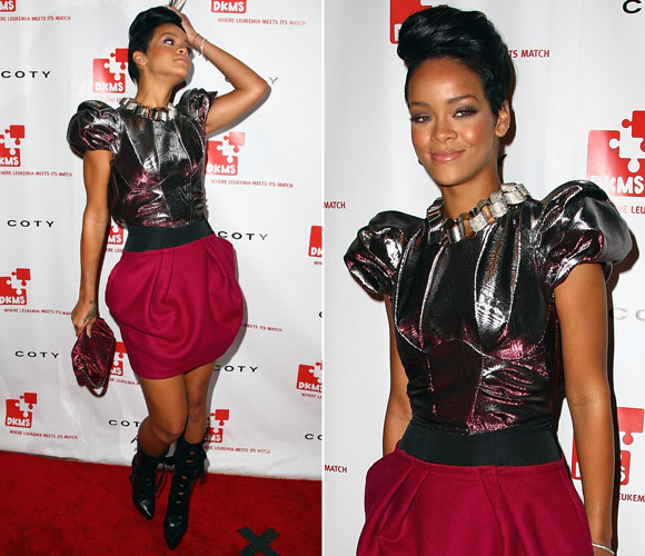 Um dos primeiros looks da nova fase fashion da Rihanna (da qual faz parte o cabelo curto com topete!), a combinação da blusa futurista e a saia vinho mostrou que a cantora estava pronta para mostrar sua personalidade na moda. Arrasou!