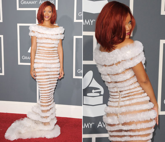 O modelo do vestido até é um clássico, mas quando se trata do estilo da Rihanna pode esperar muita ousadia! É aí que entram as transparências, que aparecem ao longo do corpo todo, intercalada por babadinhos: sem dúvida um dos vestidos mais comentados da noite!