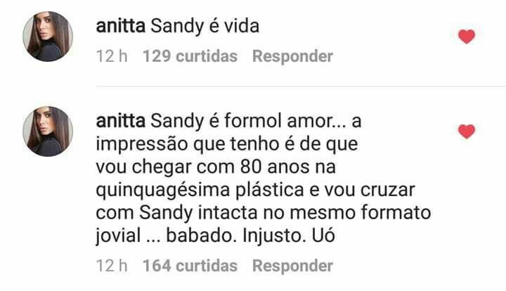 Mas o que a gente amou mesmo foram os comentários da Anitta na foto! Além de escrever “sua fã desde sempre”, a cantora ainda brincou com a jovialidade da amiga: “Sandy é vida. Sandy é formol amor… a impressão que tenho é de que vou chegar com 80 anos na quinquagésima plástica e vou cruzar com Sandy intacta no mesmo formato jovial… babado. Injusto. Uó”.