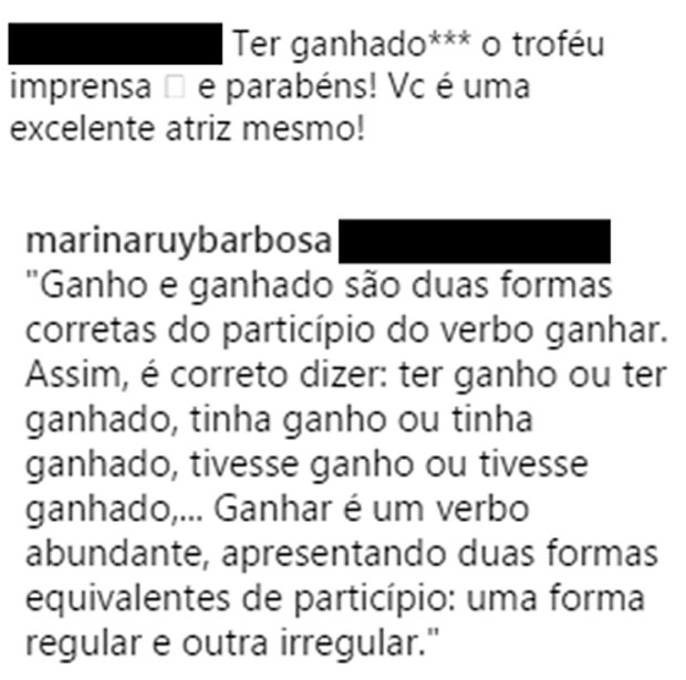 “Muito feliz de ter ganho o #TrofeuImprensa pela novela #TotalmenteDemais!”, escreveu Marina na legenda de uma foto em seu Instagram. Acontece que uma fã achou que a frase estava errada e tentou dar um toque para a atriz, explicando que o certo seria “ter ganhado”. Apesar de ter corrigido o erro, a seguidora ainda deu os parabéns para Marina e disse que ela era “uma excelente atriz”.