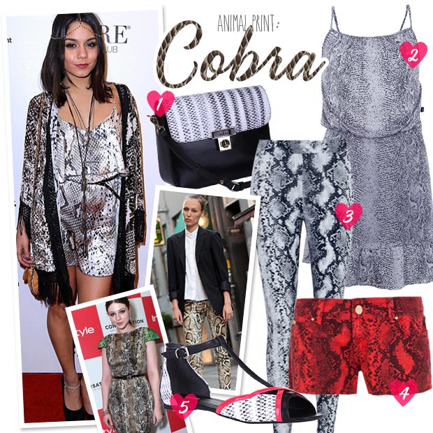 Assim como a estampa de onça, a de cobra também passa uma imagem sexy e de personalidade. Apesar dos acessórios serem mais comuns, vale ousar e apostar nas roupas com a estampa.